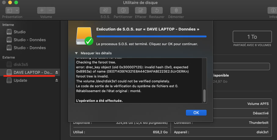 Bonjour à toutes et à tous, depuis quelques jours mon 13" Retina Début 2015 - Intel i7 3,1 GHz - 16 Go RAM, 1 To SSD, s'arrête de démarrer au 3/4 de la pomme J'ai tenté maintes fois de vérifier et surtout de le réparer via l’utilitaire de disque et le terminal en mode "recovery " Mais rien y fait. De retour chez moi, j'ai pu enfin le mettre en mode disque Cible ("Target"); à savoir que ce qui est monté sur mon Imac (sous Monterey aussi), est juste un disque appelé Update. Cependant, le disque de donnée est visible par l'utilitaire de disque mais n'est pas visible par le Finder. Idem pour le Macintoh HD (disk3s5). ![]() ![]() ![]() Voici ce que je peux lire en cherchant avec le terminal avec la commande : Citation diskutil list external : Résultat: Citation /dev/disk2 (external): #: TYPE NAME SIZE IDENTIFIER 0: GUID_partition_scheme 1.0 TB disk2 1: EFI EFI 209.7 MB disk2s1 2: Apple_APFS Container disk3 1.0 TB disk2s2 /dev/disk3 (synthesized): #: TYPE NAME SIZE IDENTIFIER 0: APFS Container Scheme - +1.0 TB disk3 Physical Store disk2s2 1: APFS Volume DAVE LAPTOP - Données 658.2 GB disk3s1 2: APFS Volume Preboot 294.8 MB disk3s2 3: APFS Volume Recovery 1.1 GB disk3s3 4: APFS Volume VM 1.1 MB disk3s4 5: APFS Volume 15.4 GB disk3s5 6: APFS Volume Update 2.8 MB disk3s6 Ensuite avec la commande: Citation diskutil verifyVolume disk3 : Résultat: Citation Started file system verification on disk3 Verifying storage system Performing fsck_apfs -n -x /dev/disk2s2 Checking the container superblock warning: container has been mounted by APFS version 1934.141.2, which is newer than 1412.141.3.7.2 warning: disabling overallocation repairs by default; use -o to override Checking the EFI jumpstart record Checking the space manager Checking the space manager free queue trees Checking the object map Checking volume Checking the APFS volume superblock The volume DAVE LAPTOP - Données was formatted by hfs_convert (1934.141.2) and last modified by apfs_kext (1412.141.3.7.2) Checking the object map Checking the snapshot metadata tree Checking the snapshot metadata Checking the extent ref tree Checking the fsroot tree error: drec_key object (oid 0x300007125): invalid hash (0x0, expected 0x8953a) of name (0E07143974321E8A44C9AFA8E223E2.5UrOERKn) fsroot tree is invalid The volume /dev/disk2s2 could not be verified completely Storage system check exit code is 0 Finished file system verification on disk3 Je me suis aussi référé à ce post sur un autre site, qui m'a l'air proche de mon cas. Le truc que je ne comprends pas et que j'aimerais aussi éclaircir : est ce que mon hd est mort ? Ou est ce juste une incidence réparable ? puis-je tt de même récupérer mes datas ? l'effacer et faire une clean installation possible ? Merci d’avance pour vos lumières. |