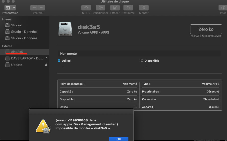 erreur -119930868 dans com.apple.DiskManagement.disenter.) Impossible de monter « disk3s5 ».