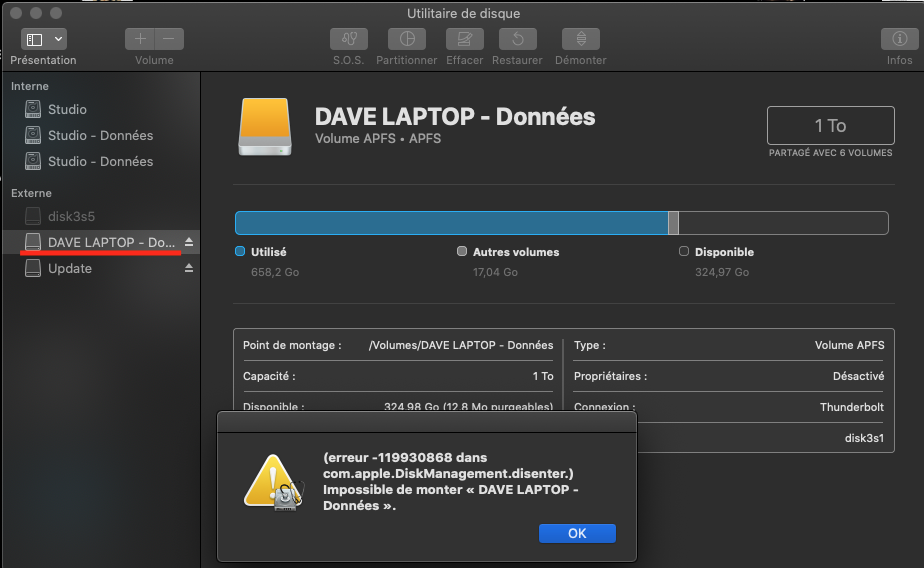 Volume DAVE LAPTOP - Données on disk3s1 mounted |