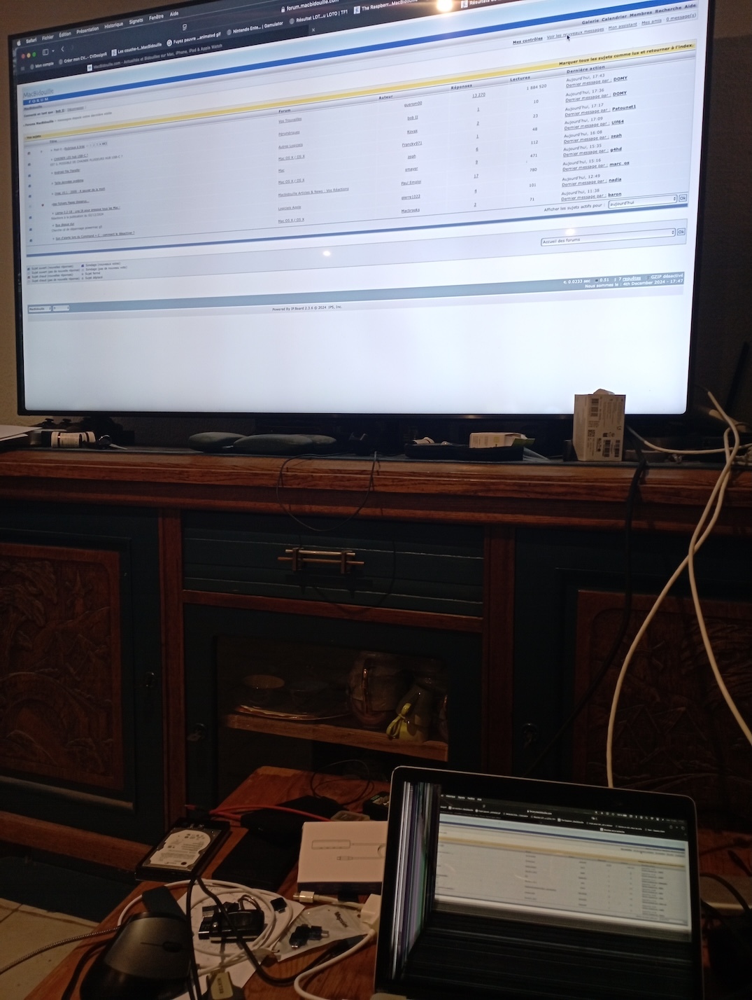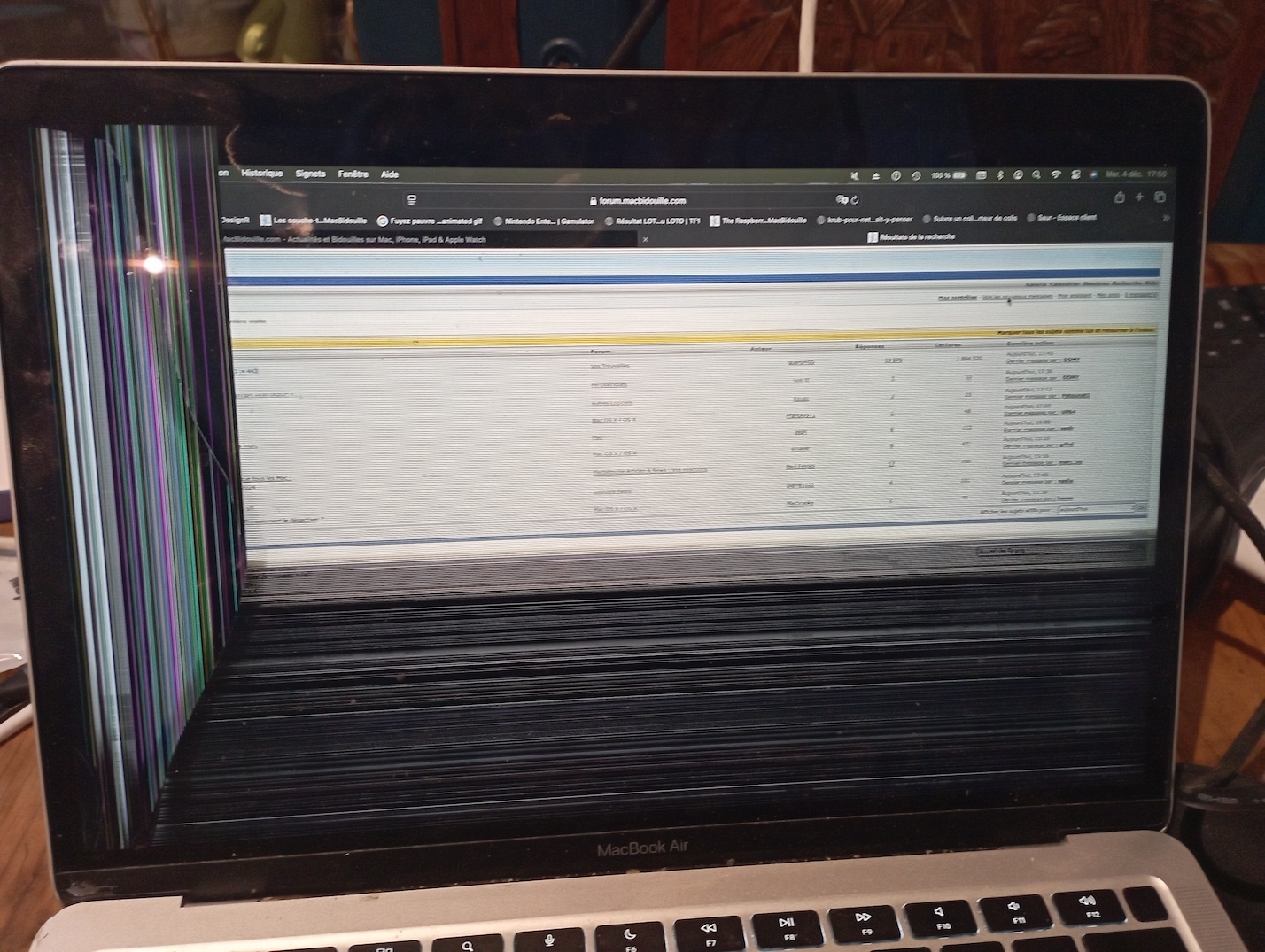 Hier il m'est arrivé un drame , je me suis endormi avec mon ordinateur portable et il a fait une chute de trop. l'écran est cassé et n'affiche que très peu de chose visible. Etape 1 essayer de la brancher sur un écran externe. soit via Air Play téléviseur, soit physiquement via mon adaptateur multifonctions. Problème n°1 , je ne peut pas sélectionner l'utilisateur et entrer le mot de passe à l'aveugle. Problème n°2 , Impossible de me connecter en HDI Etape 2 par je ne sais quelle miracle je suis parvenu à me connecter à l'aveugle et à utiliser AirPlay. J'ai normalement demandé un démarrage automatique l'utilisateur principal sans mot de passe et sans liste. Mais je ne sais pas pourquoi l'ordinateur n'a pas gardé ces réglages ! Je me suis finalement rendu compte que mon adaptateur ne fonctionnait plus pour le USB-C vers HDMI Achat d'un adaptateur simple USB-C vers HDMI. Mon écran externe s'affiche mais pas en mode miroir. je trouve la combinaison de touche qui permet l'utilisation en miroir. çà marche mais le menu n'apparait pas à l'écran. je parviens à ouvrir un utilisateur et à démarrer le mode miroir vers la télévision. L'écran de la télévision apparait lui en entier et c'est fonctionnel. Arrivé à cette étape j'ai plusieurs soucis En 1 comment démarrer à chaque fois sans avoir à taper mon de passe et en Air Play activé ? ou en 2 comment démarrer à chaque fois sur l'écran externe qui est branché en HDI mais avec un affichage complet et pas tronqué ? En 3 je suis un peu dans le flou, que faire ? Que va devenir cet ordinateur ? Plusieurs paramètres , le changement d'écran coute 400 euros, je devais déjà faire changé la batterie entre 150 et 200 €. Je vois des Macbook Air M1 reconditionnés avec garantie à 650 € et macbook Air M2 à moins de 900 € neuf. Dans un premier temps je pense à l'utiliser comme une machine de bureau ur un écran externe. je viens d'acquérir un SSD externe qui va me servir de sauvegarde en remplacement de mon vieux HDD externe. Je vais commencer par optimiser mes sauvegardes. Je ne sais pas combien de temps peu fonctionner ce Mac avec un écran cassé ? je ne sais vraiment pas quoi faire, le réparer me couterait aussi cher que d'en acheter un autre. je pourrai essayer de la garder en machine de bureau, mais combien de temps çà va fonctionner ? Est ce que j'oublie l'utilisation d'un portable et m'oriente vers un Mac Min M4 qui va me couter bien moins cher pour plus performant et moins sujet au chutes et au drame ? -------------------- Mac Mini M4 16 Go SSD 256 Go Mac OS Sequoia 15.1.1, Macbook Air 13" M1 8 Go SSD 256 Go écran cassé Mac OS Sequoia 15.1.1 et Apple TV 4K tvOS 15.2 |