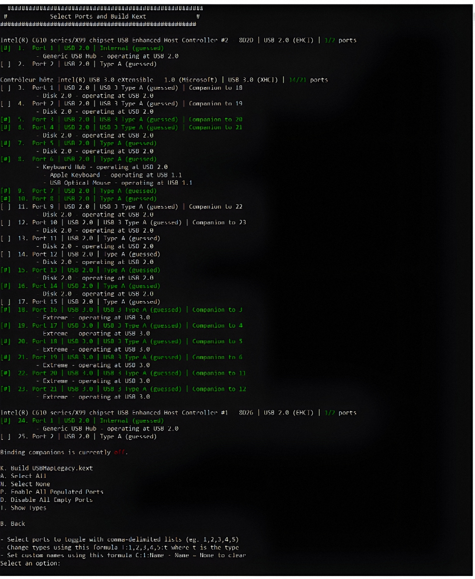 Hum, j'ai cru comprendre que pour les ports liés (USB 3 à USB 2), C'était justement le but de Bind Companions. Donc si l'on met cette option sur disabled, on peut par exemple choisir USB3 et supprimer USB2. Ce qui me conviendrait tout à fait : j'ai 4 USB 3 à l'arrière et 4 USB 2.  / 2 USB 2 et 2 USB 3 en frontal. Donc garder les USB 2 en façade (soit 4 USB 2) me convient tout à fait. Je peux ainsi supprimer 8 USB 2. Donc là, cela devrait me suffire. Je n'ai plus tout à fait le nombre de ports de ma carte mère : 22 ou 23 ? Je regarderai attentivement. Bon, je trouve que c'est plus simple avec Hackintool surtout depuis qu'on à USBinjectAll qui fonctionne à nouveau en complément de XhciPortLimit.