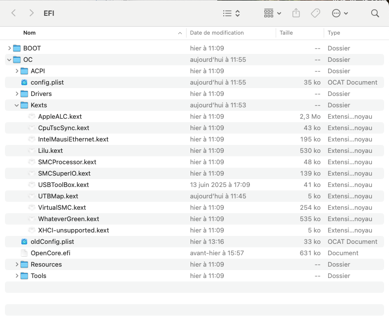 Oui, j'ai bien mis Mojave comme système. Je regarderai dans quel ordre j'ai mis les deux kexts. J'ai pas fait trop attention en les collant dans le dossier kexts. Je regarderai avec OCAT.